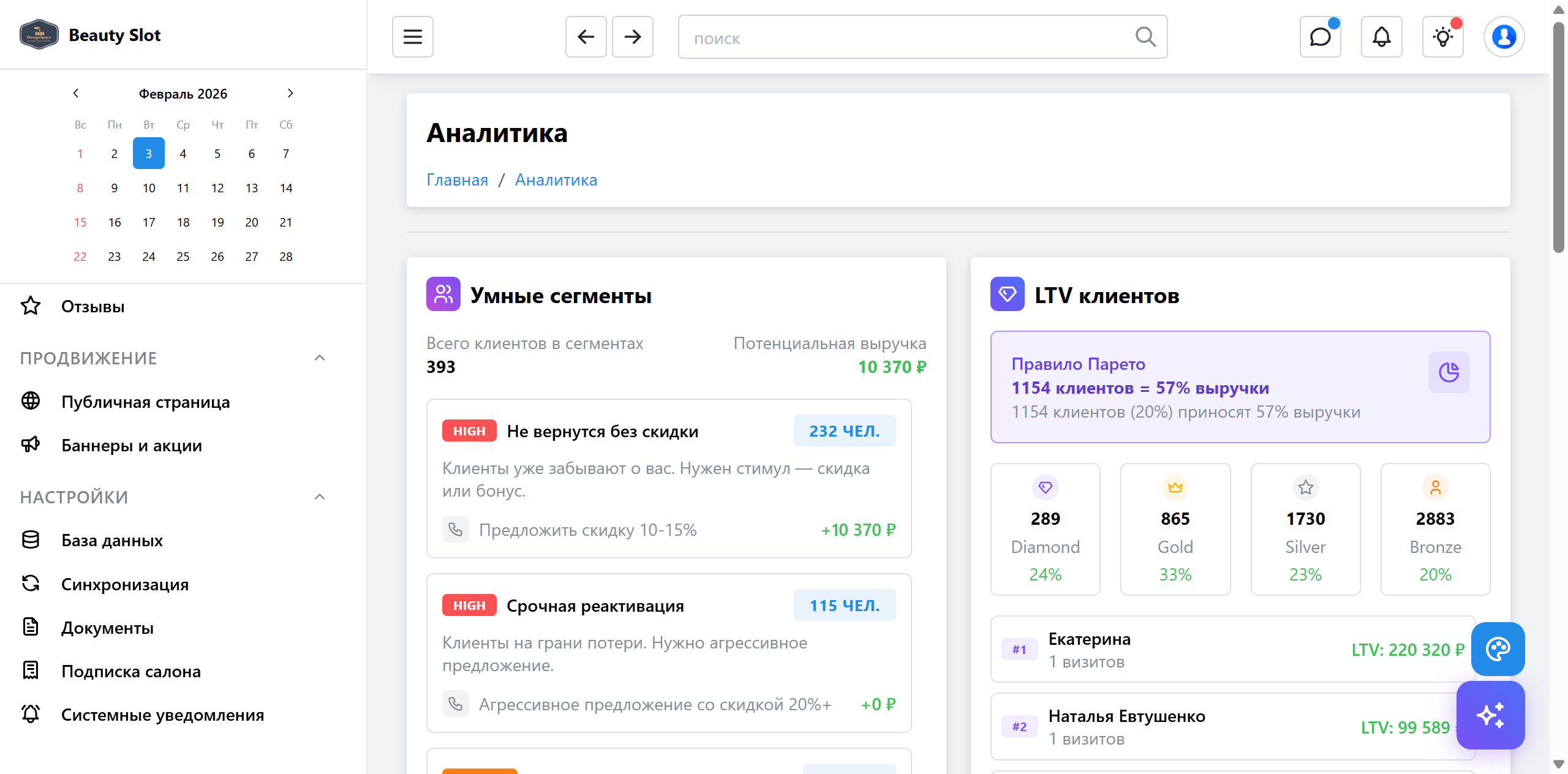 Умная аналитика с AI-insights. Дашборды с ключевыми метриками, LTV клиентов, загрузка мастеров, retention.