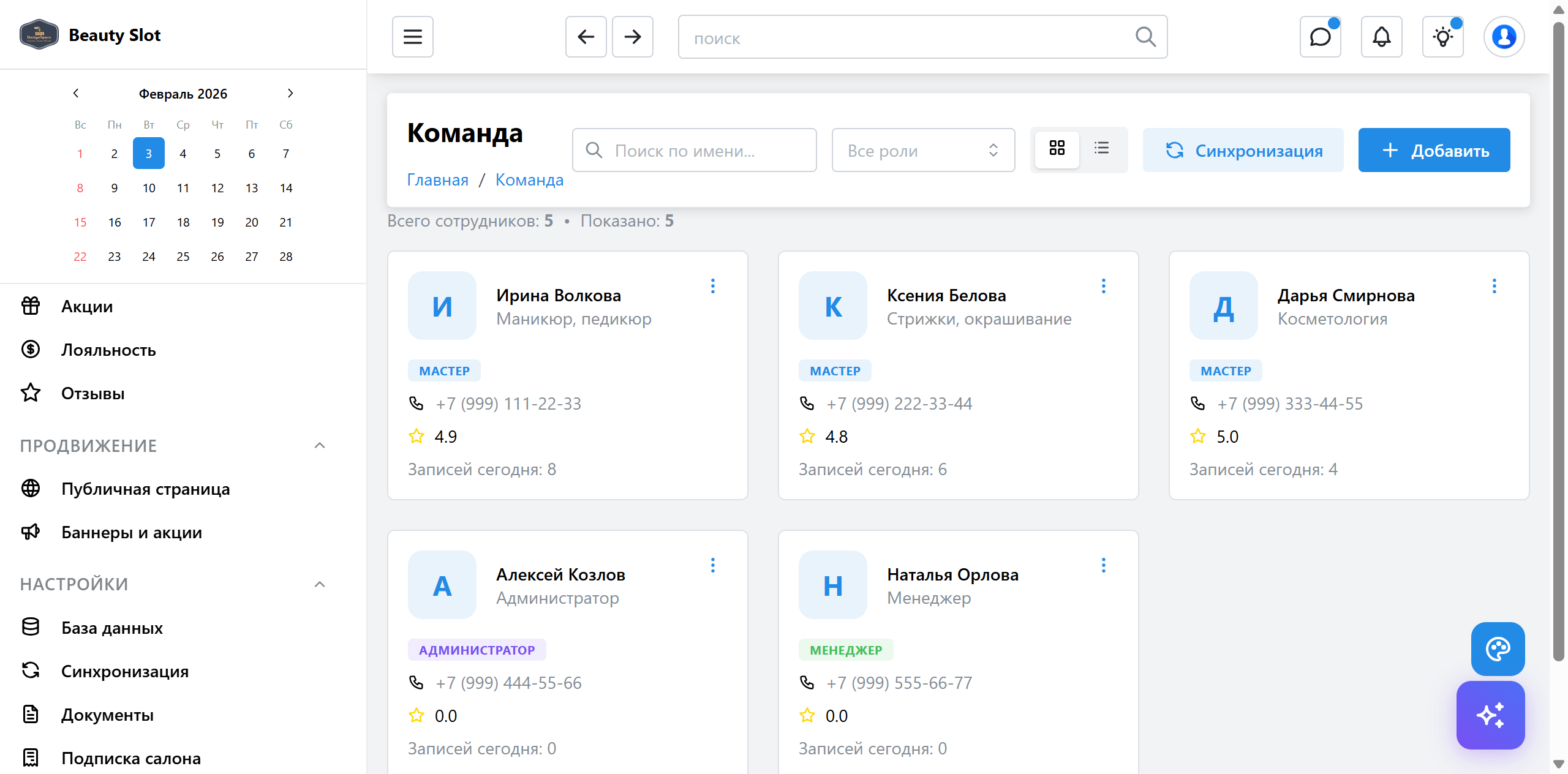 Карточки мастеров, расписание работы, выходные и отпуска. Статистика производительности по каждому сотруднику.